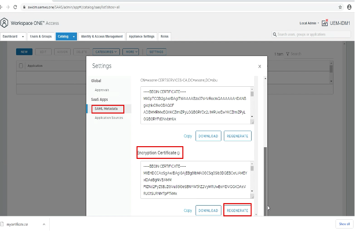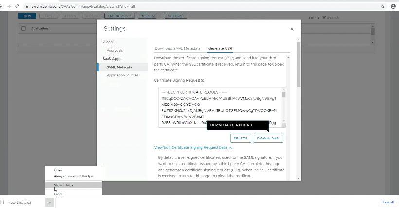 There are five main steps involve changing the SAML signing certificate from WS1 Access to third party CA. We will also re-generate an Encryption certificate during this process. Changing the Encryption certificate is totally optional.