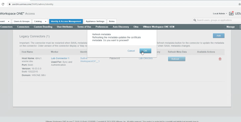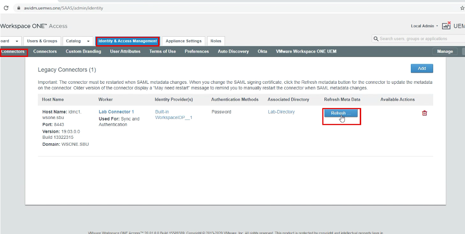 2. –    Log in to WS1 Access as the root account, and navigate to Identity & Access Management > Connectors > Refresh Metadata to each connector.