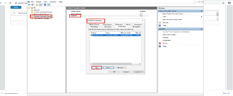 Log in. to your ADFS server and open ADFS. application, go to Claim Provider Trust, Select AWIDM > Properties.(Your Display name could be different, but select WS1 Access environment you configured previously)