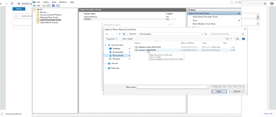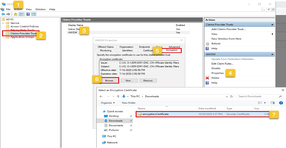 2. To update the Encryption cert,  Open ADFS and go to Claim Provider Trust, Select IDM > Properties>Encryption and select the Encryption Cert you download.