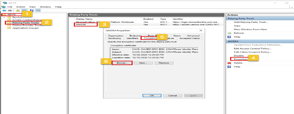 4.Update Relying Party Trust Encryption Certificate Open ADFS and go to Relying Party Trust, Select IDM > Properties