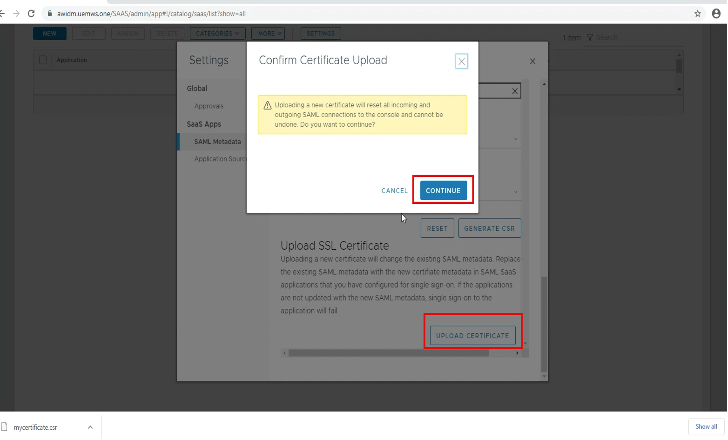 1. – Login into WS1 Access admin console as a root account, and navigate to Catalog > WebApps > Settings > SAML Metadata and Select Upload Certificate from the CA authority and Continue on Confirm page.