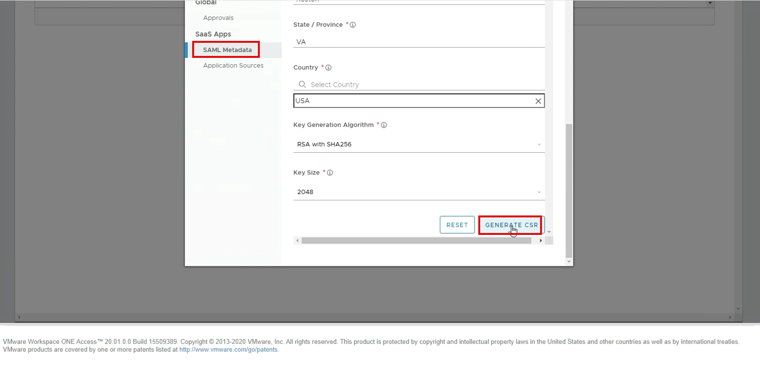 • Generate a New Certificate Signing Request (CSR) from WS1 Access